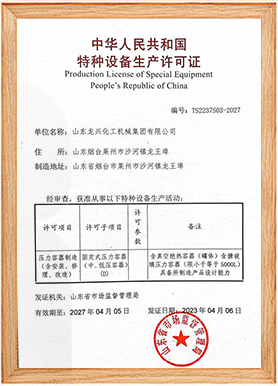 資質證書號:壓力容器制造證:TS2237S03;鍋爐制造許可證:TS2137116